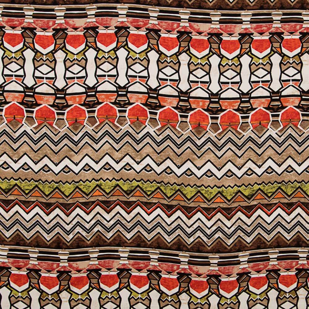Estampado estilo maya de formas geométricas en tonos naranjas. Viscosa con caída, muy fluida y fina, con un ligero satinado. Tela para vestidos, faldas, pantalones, blusas y todo tipo de prendas de moda. Al ser un tejido 100% viscosa, recomendamos un lavado previo a ser manipulado.