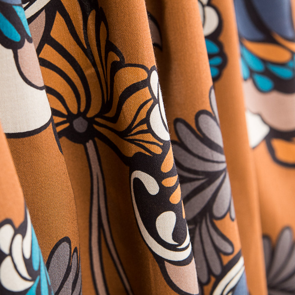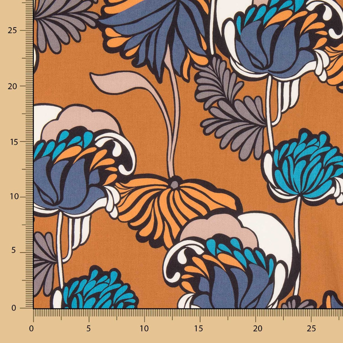 Tecido estampado de flores azuis sobre fundo de viscose caramelo. Viscose estampada com queda, muito fluida e fina, sem se tornar translúcida. Tecido para vestidos, saias, calças, blusas e todos os tipos de vestuário de moda. Como é um tecido 100% viscoso, recomendamos uma lavagem antes de manusear.