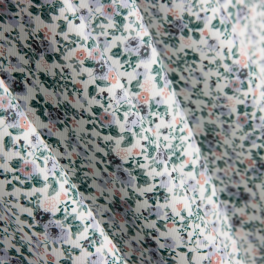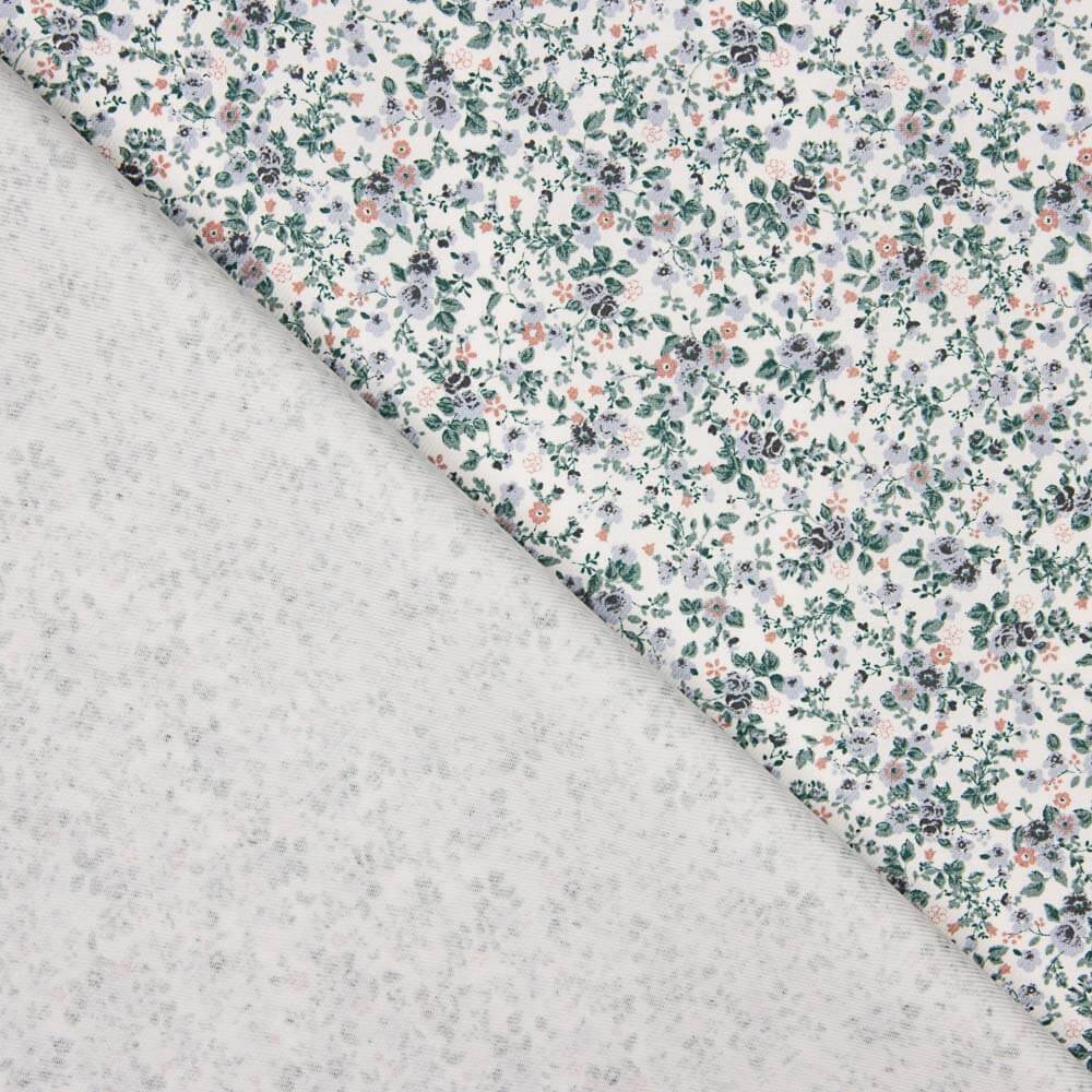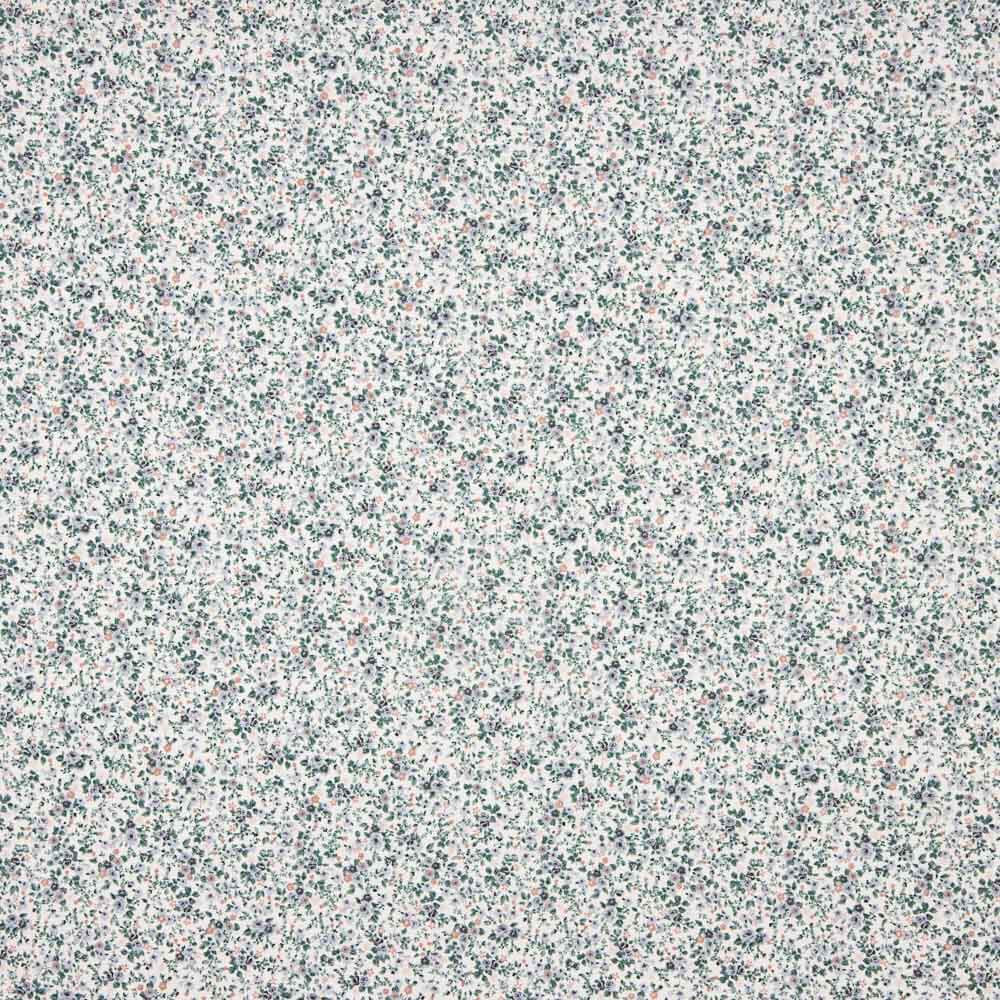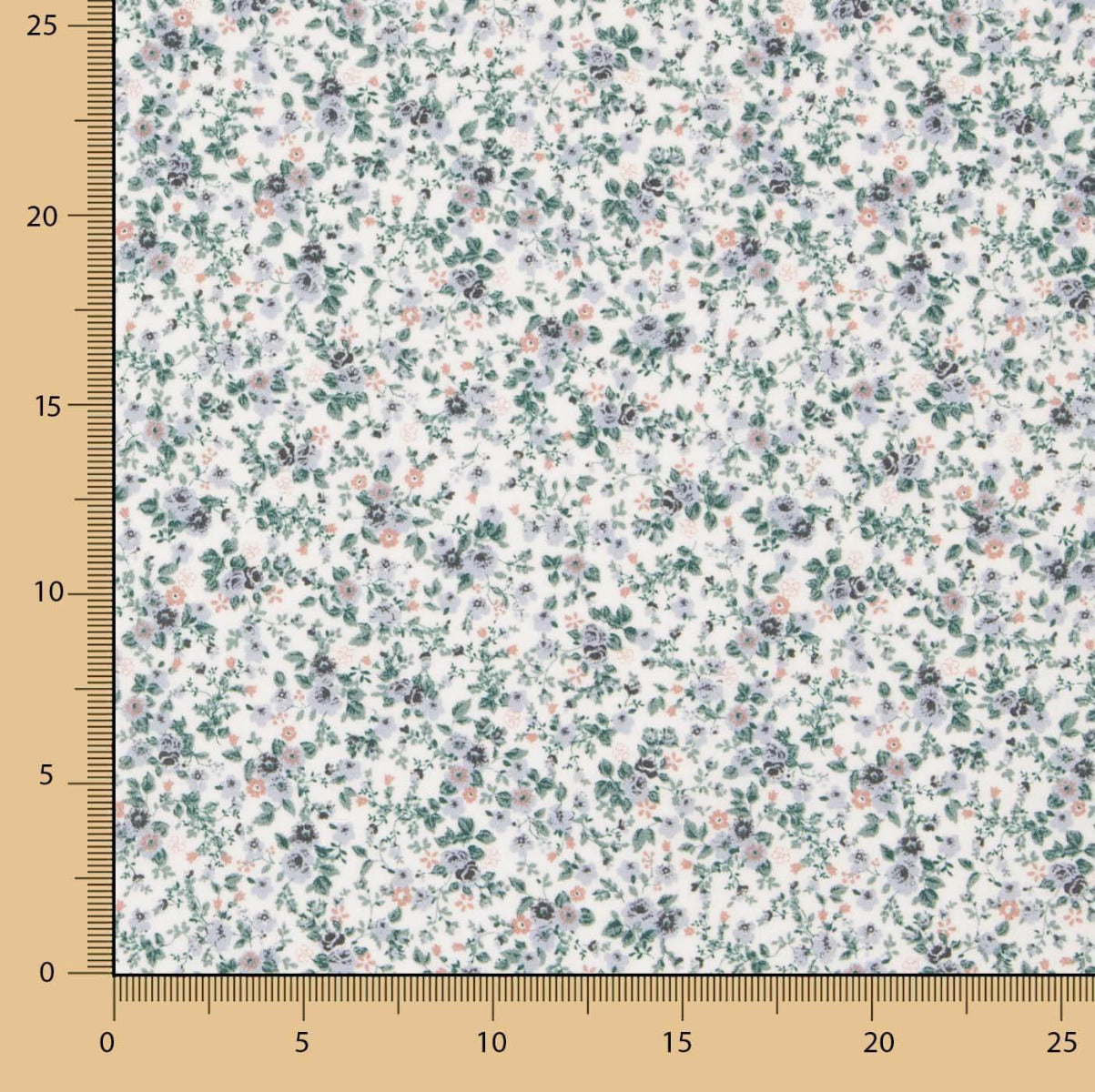 Tecido viyela de algodão com estampa de pequenas flores azuis sobre fundo branco. Viyela é um tecido muito macio, sustentado e leve, com uma trama que lembra a sarja. Tecido de algodão ideal para confecção de vestidos e camisas.