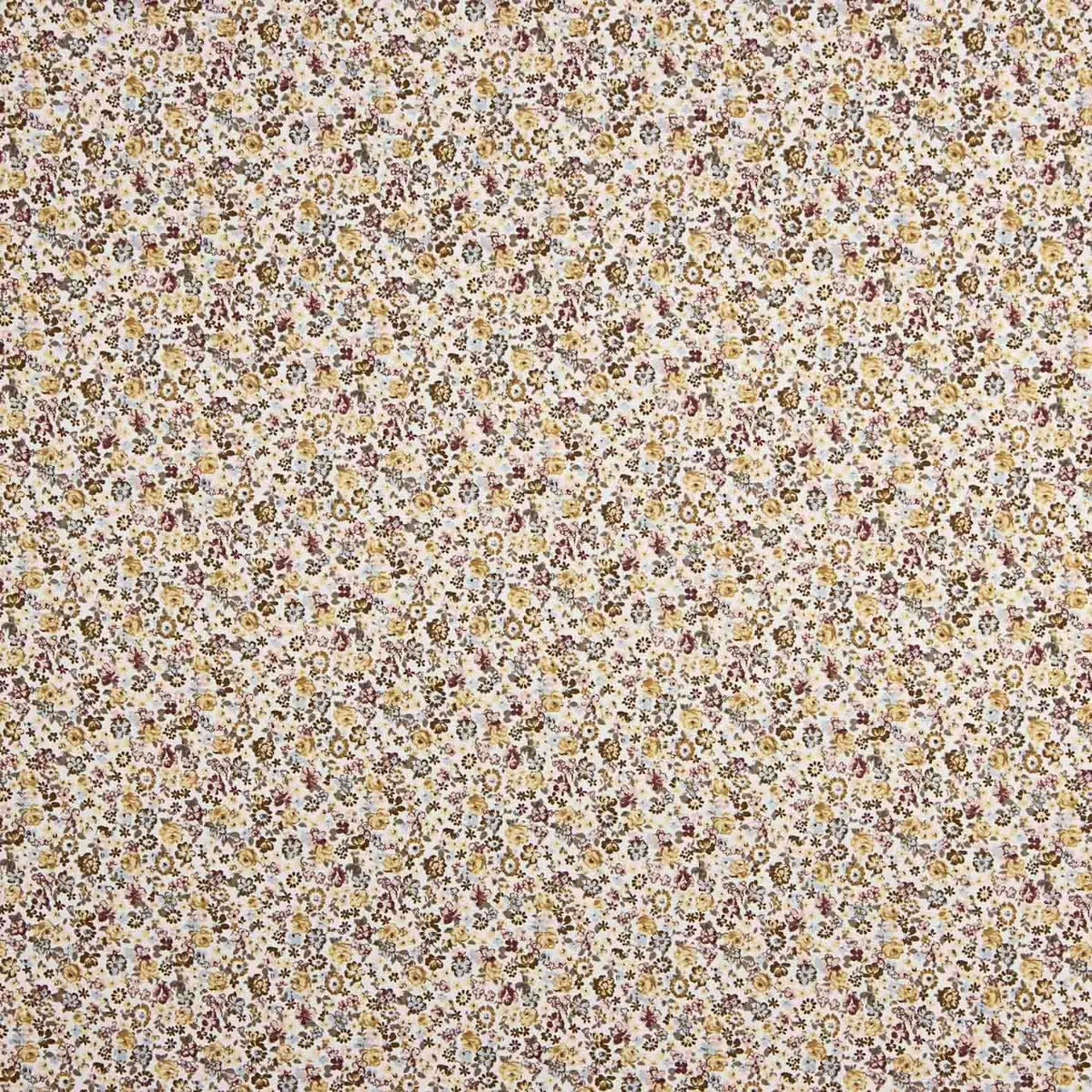 Tecido Viyela de algodão com toque suave e estampado de pequenas flores que combina tons ocres, marrons e celeste. Ideal para confeccionar camisas, vestidos e roupas infantis, sua leveza garante conforto e transpiração. O delicado estampado floral adiciona um toque romântico e atemporal, perfeito para designs elegantes e versáteis. Com este tecido de alta qualidade, suas criações se destacarão por seu encanto natural e sofisticado.