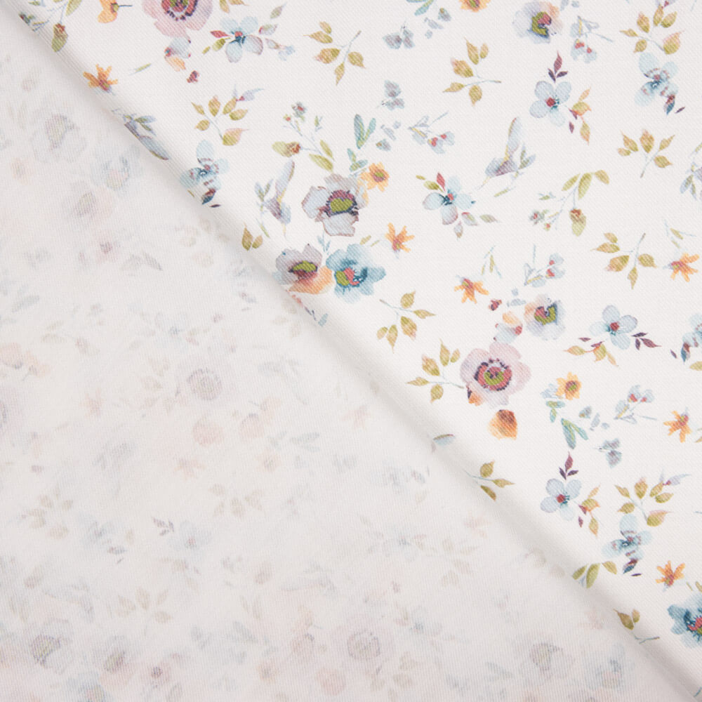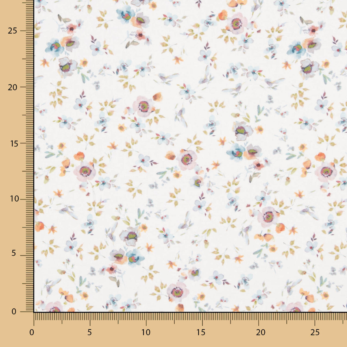 Viyela de algodão infantil com estampado flores Cristina. Tecido muito macio e agradável ao toque com uma textura de pelúcia, ideal para vestuário de meia estação, acessórios e vestuário infantil.