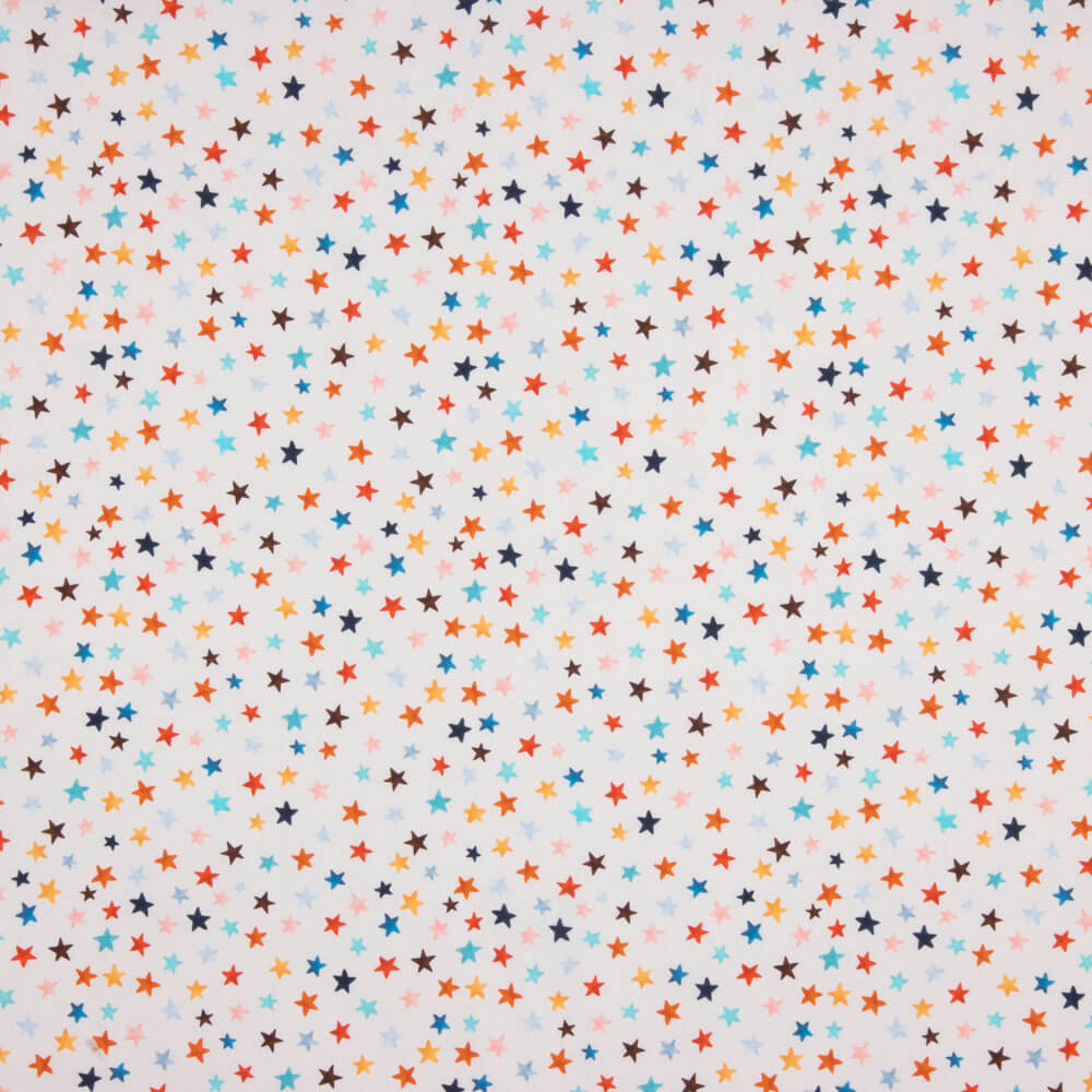 Viyela de algodão para roupa infantil com desenho de multii estrelas camel claro. Tecido muito macio e agradável ao toque com uma textura de pelúcia, ideal para vestuário de meia estação, acessórios e vestuário infantil.