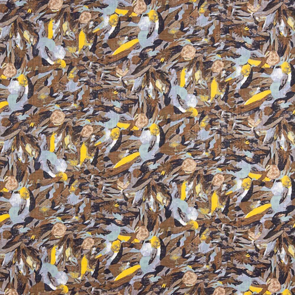 Compre tecido voile de algodão estampado folhas azuis. Tecido voile de algodão muito fino e agradável para forrar vestidos de verão ou camisas leves. Tecido macio, fino e respirável, muito agradável pela sua composição.