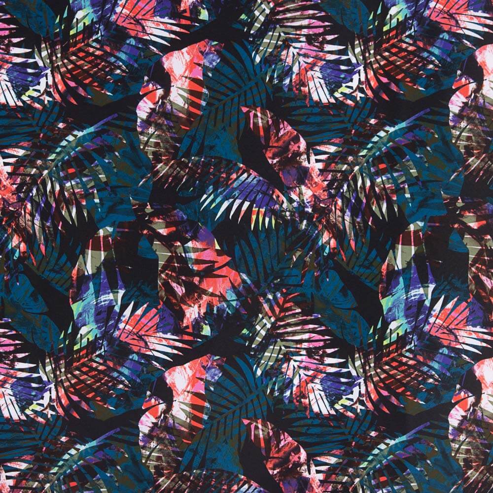 Tecido de poliéster repelente à água com estampado digital de folhas grandes em vários tons de cores. O water repellent é um tecido de poliéster fino e muito macio, durável e totalmente opaco. Ideal para parkas, jaquetas e quebra-ventos.
